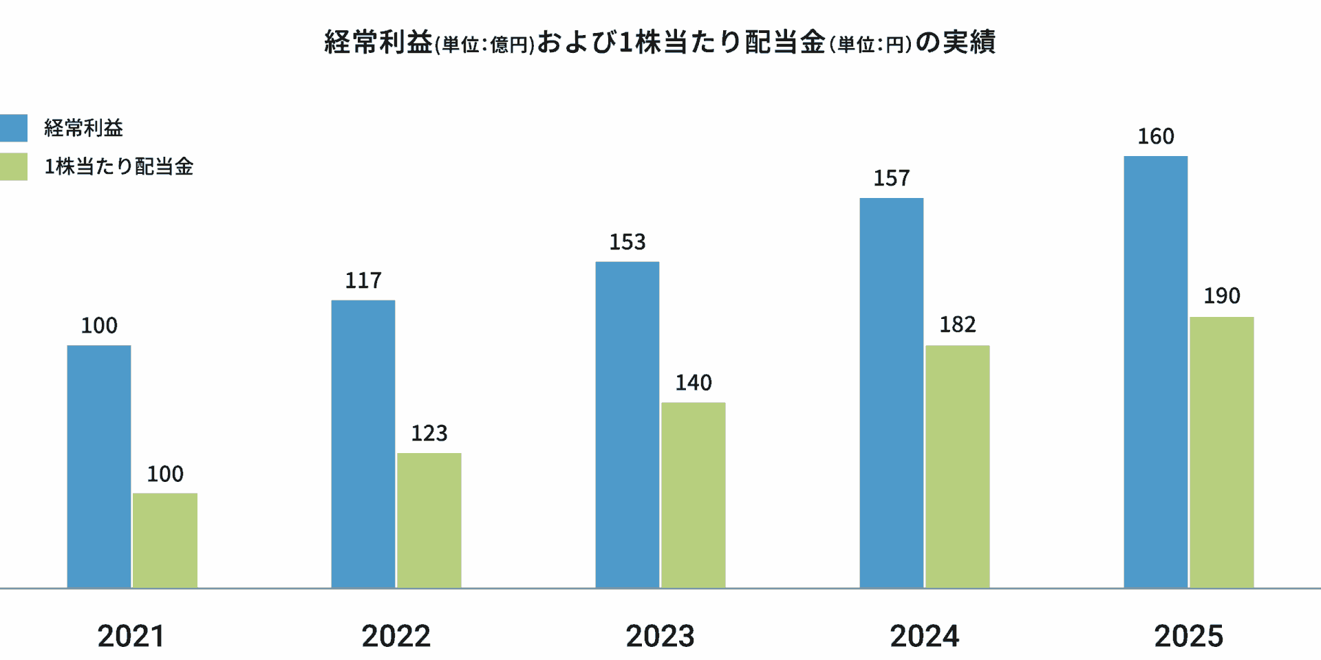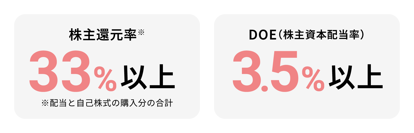 株主の皆様への還元は配当を以て行うこととし、中期経営計画「Growing Together 2026」においては株主還元率33%、DOE(株主資本配当率)3.5%の水準を目標に、安定配当を継続してまいります。