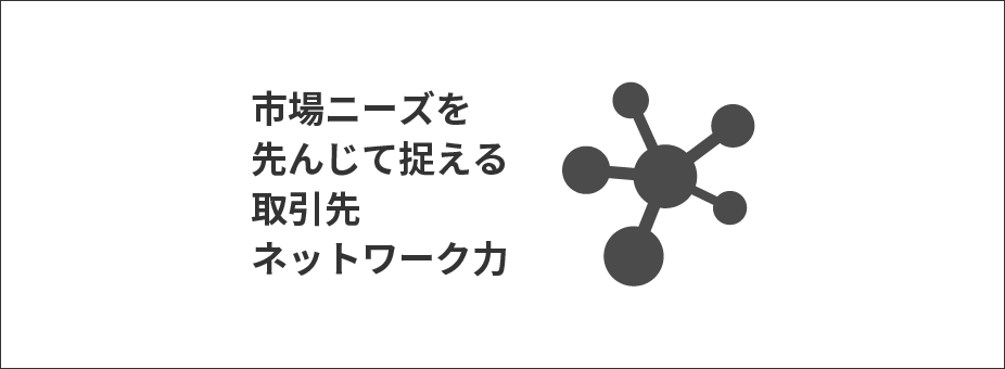当社が有する主要仕入先様6,000社、主要販売先様20,000社のネットワークは、競争優位をもたらすビジネス領域の広さのみならず、その幅広いネットワークから集められる最新の市場動向やユーザーの声を反映し、製品・市場戦略に展開できる強みそのものとなっています。