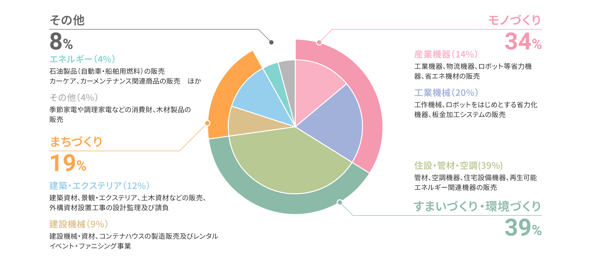 「モノづくり」「すまいづくり」「環境づくり」「まちづくり」の4つのビジネスフィールドで事業を展開。7つの事業セグメントを有し、「モノ売り」と「コト売り」の両面で社会課題解決に挑みます。