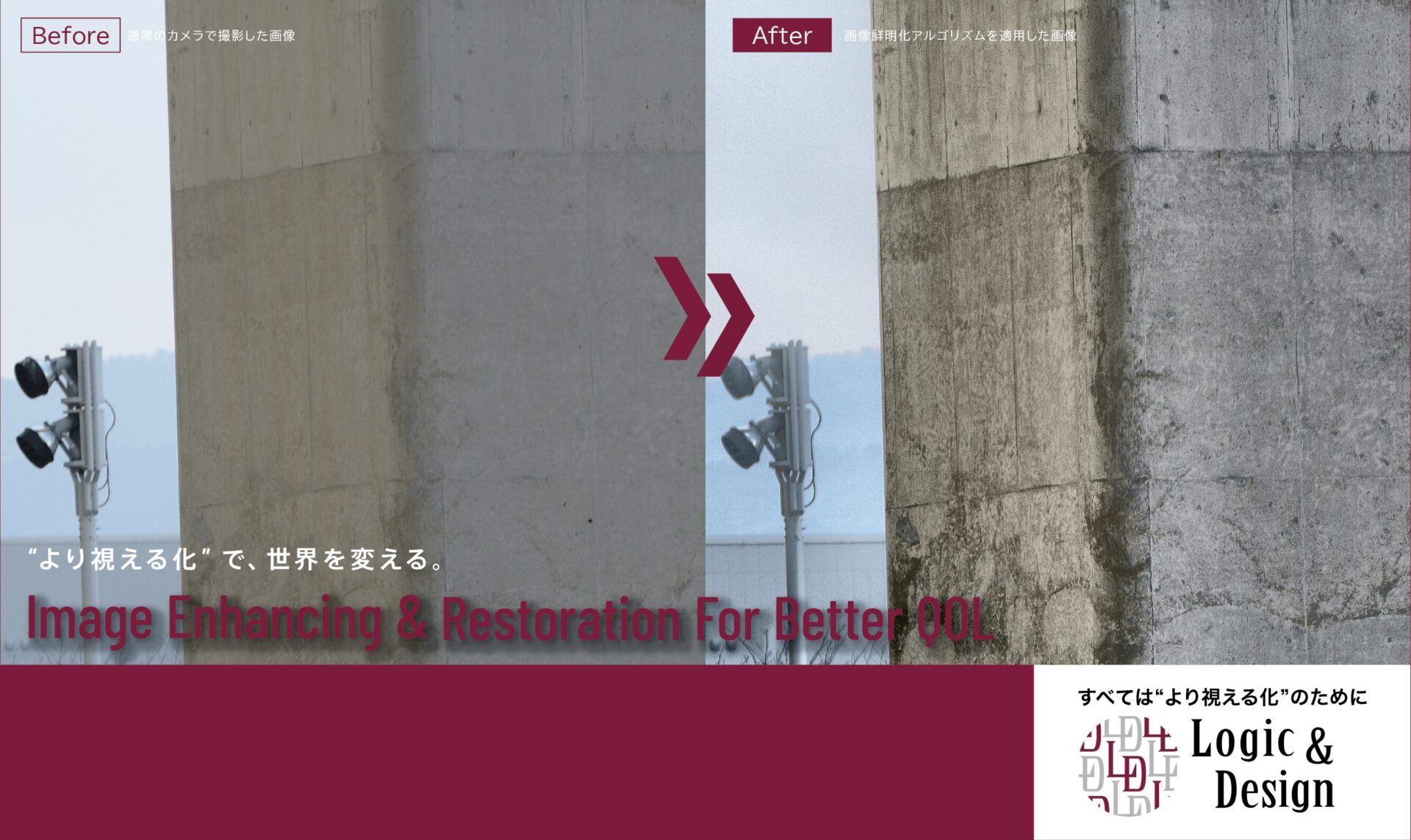カメラで識別できる明るさの範囲をダイナミックレンジといいますが、不鮮明な見えにくい画像の多くは、ダイナミックレンジの狭さが原因です。その狭くなったダイナミックレンジを当社独自のアルゴリズムで拡げることで、カメラが記録した画像データの再現性をより高め、一様なコントラストを持つ鮮明な画像にする技術です。