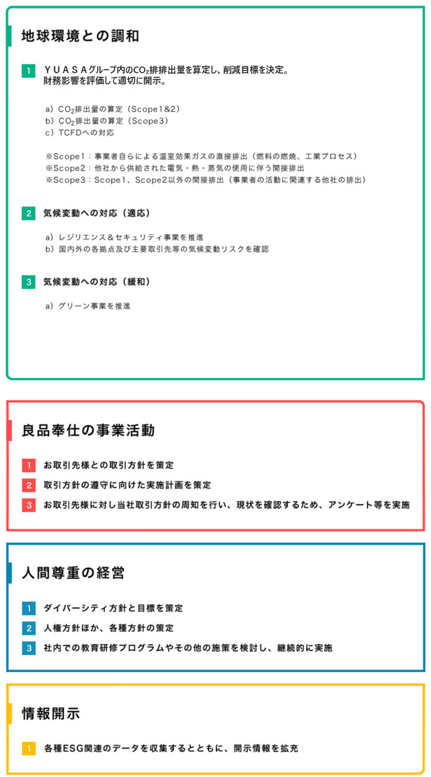 2030年度までにYUASAグループ全体のカーボンニュートラルを目指すとともに、双利共生の関係を重視し、気候変動への対応とサプライチェーン全体での環境負荷の低減に努めます。