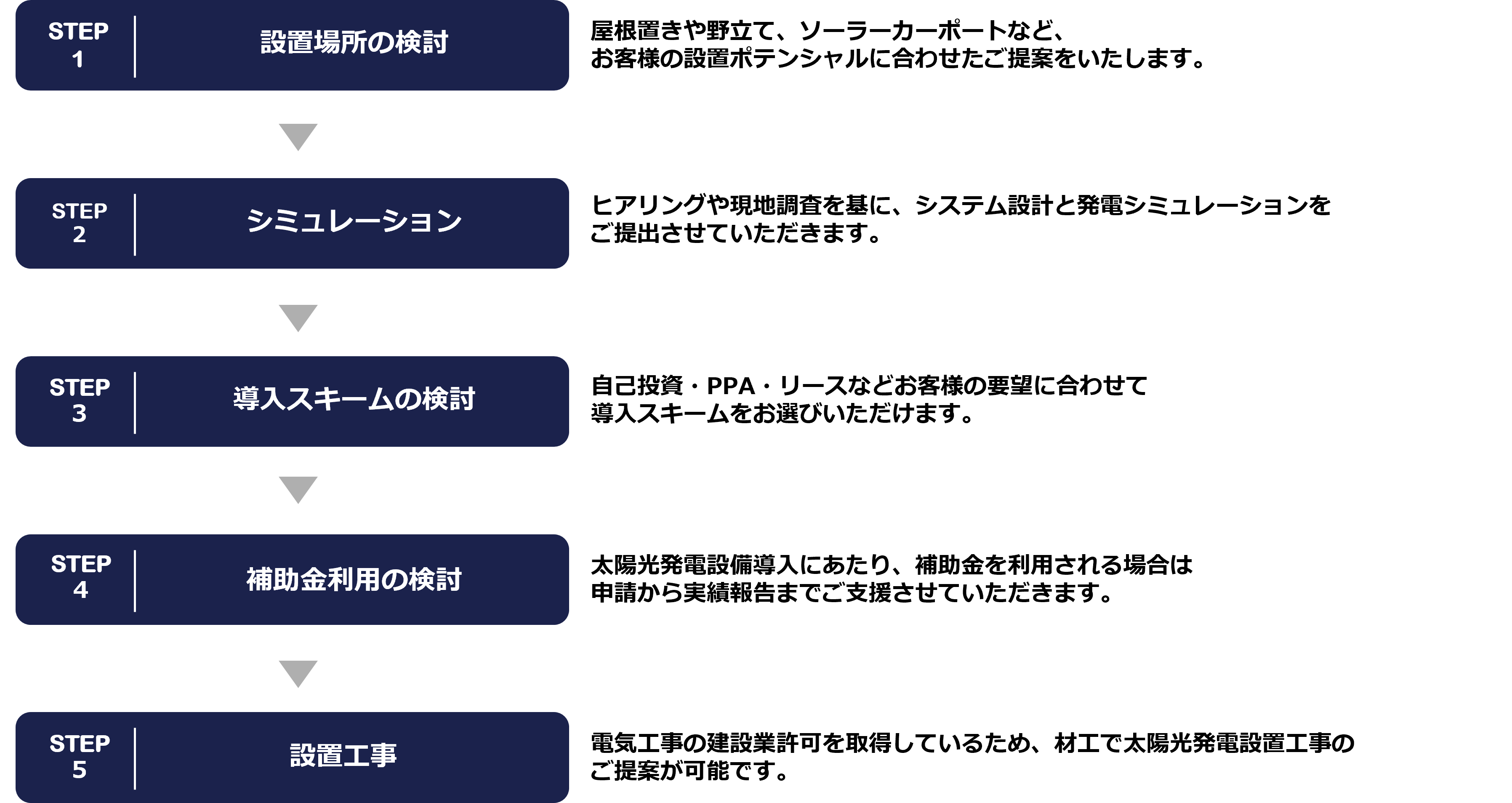 「初期投資を抑えたい」「屋根以外の場所を活用したい」「使える補助金を知りたい」など、企業の課題に合わせて最適なプランを設計するには、専門的な知見が求められます。